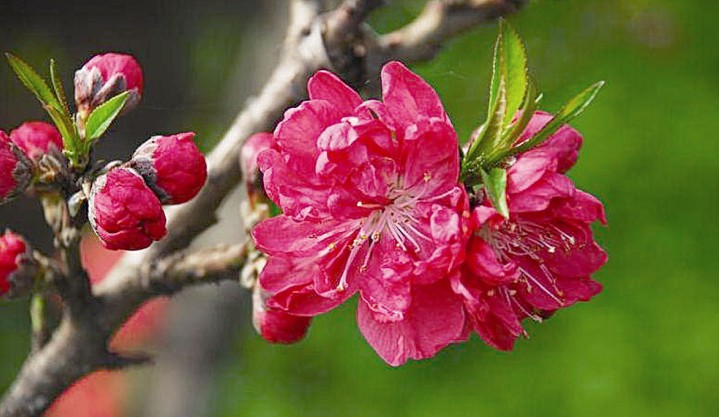 桃花,屬薔薇科,落葉小喬木,高可達6一8米。樹干灰褐色,粗糙有孔。小枝紅褐色或褐綠色,平滑。葉橢圓狀披針形,邊緣有細鋸齒?;▎紊邪住⒎奂t、紅等色,重瓣或半重瓣,花期3月。核果近球形,表面密被短絨毛,因品種不同,果熟6一9月。